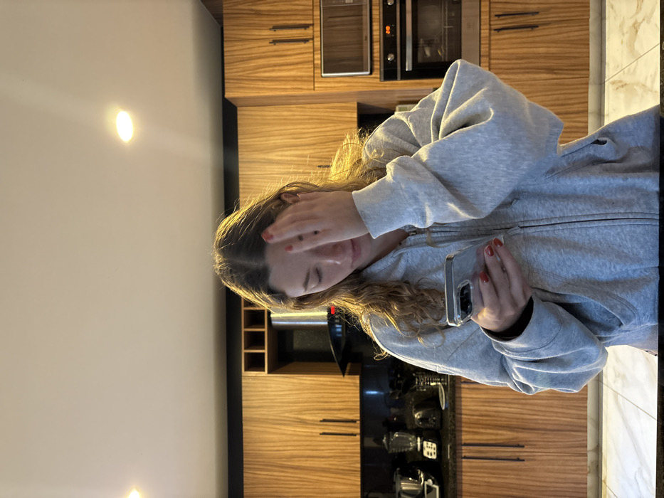 An indoor scene in what appears to be a modern kitchen in Santa Clara Ocoyucan, Mexico. A young female individual with long, wavy brown hair, illuminated with a golden hue from overhead lighting, stands in the foreground. She is wearing a light grey zippered hoodie. Her left hand holds a light-colored smartphone with a clear case, and her right hand is raised, with fingers touching her forehead/temple area. Red nail polish is visible on her fingernails. Her eyes are directed downwards, consistent with viewing the smartphone. The background features light brown wood-grain kitchen cabinets with black handles, a stainless steel cylindrical range hood, and a built-in stainless steel microwave and oven unit. The oven's digital display shows a time, possibly "2:10" or "2:18." A dark countertop on the left displays various kitchen appliances including a black blender and a silver/chrome coffee maker or similar device. The ceiling is light-colored with two illuminated recessed lights. The floor, partially visible at the bottom, is light-colored with a subtle pattern, possibly marble or tile.
