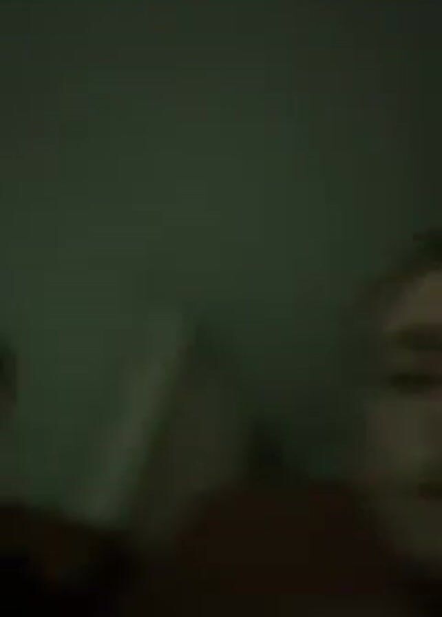 A low-angle shot shows a young man with fair skin, short blonde hair, and a mustache, looking directly at the camera. The camera then moves to show an older man with a bald head looking off to the side. The camera's movement is erratic, but it eventually settles back on the young man. The room appears to be dimly lit, and the background is out of focus, but hints of a wall with frames and a corner of a sofa are visible. An audio track accompanies the video, featuring a man speaking in Russian.