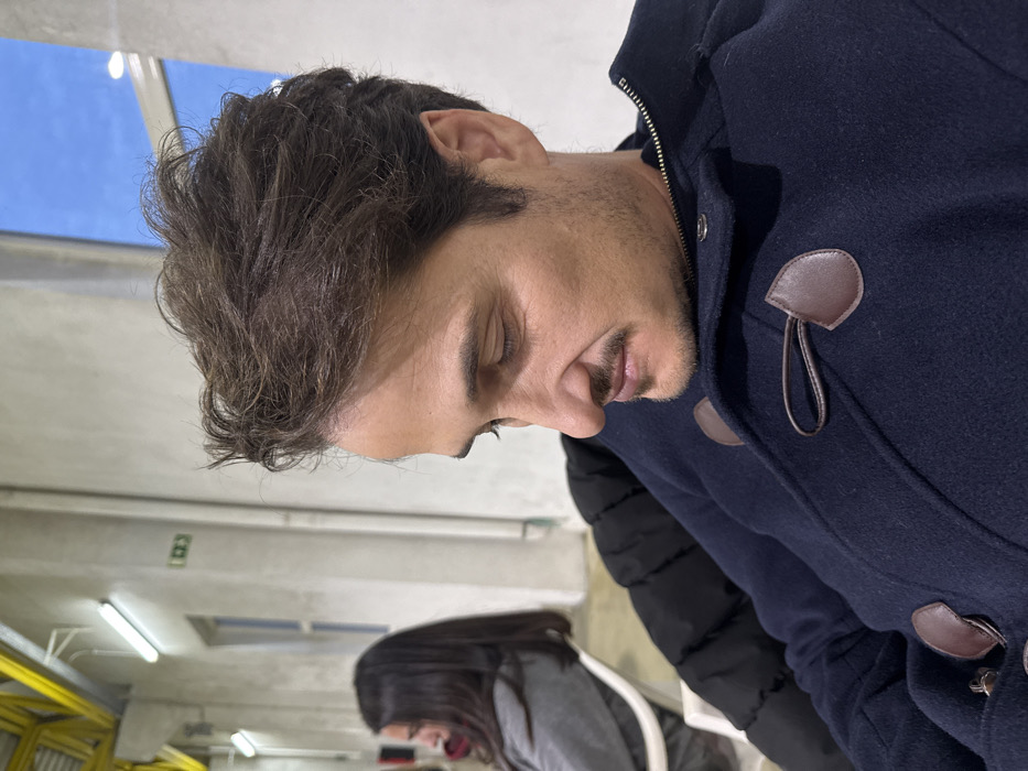 A man gazes downward, his eyes closed, wearing a dark blue coat with brown leather toggles and a zipper. His hair is short and brown, and he has a light beard. Behind him and below, a person with long, dark hair is visible. The background is a brightly lit interior, possibly a public space, with visible fluorescent lights and a glimpse of the sky through a window. The image is rotated.