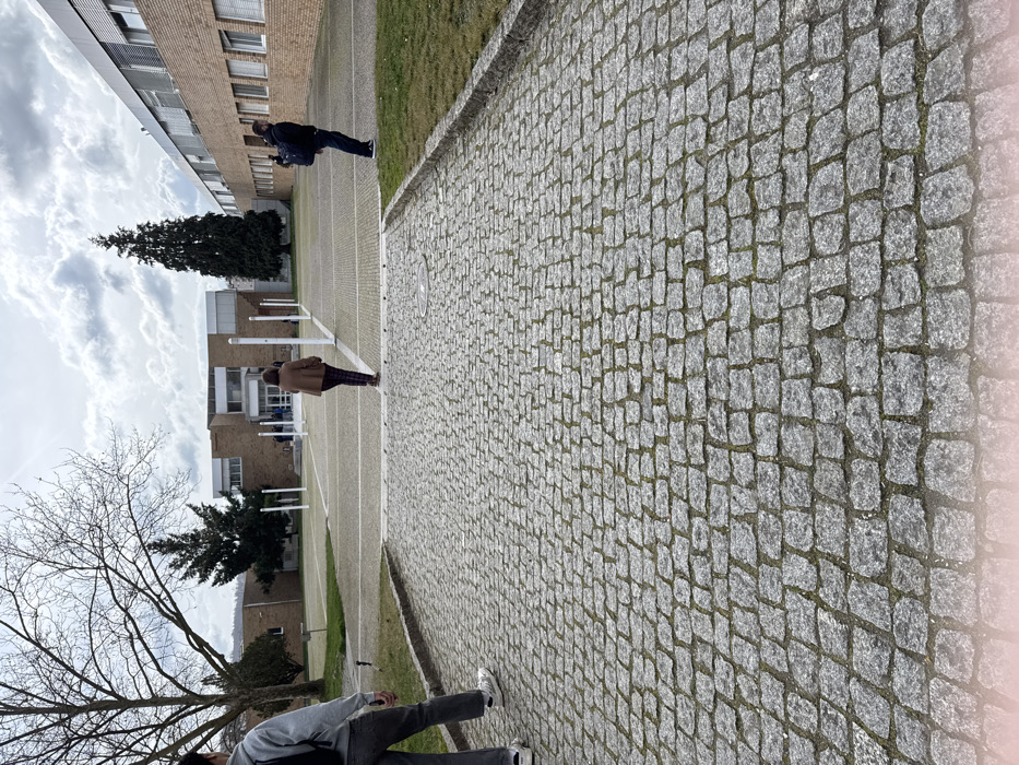 The image depicts an outdoor scene within the campus of the Instituto Politécnico de Bragança (IPB) in Bragança, Portugal, under an overcast sky. The foreground features a grey cobblestone path (calçada portuguesa) with green moss visible between stones, extending towards the viewer. A circular metal manhole cover is embedded in this path in the mid-ground. Three individuals are present in the mid-ground. On the far left, a person wearing a grey hoodie, dark pants, and white sneakers, with a black backpack, walks away from the camera. In the center, another person wearing a brown jacket, dark patterned pants, and brown shoes walks directly away from the camera, heading towards the main building. On the right, a third person, wearing a dark blue jacket, dark pants, and a dark backpack, stands facing left, partially away from the camera. The cobblestone path transitions into a patterned grey paved courtyard with distinct white linear markings. Several evenly spaced white cylindrical posts or bollards line a path leading towards the central building. Patches of green grass border the paved areas on both sides. In the background, the main building, identified as part of the Instituto Politécnico de Bragança, features a light brown brick lower facade and lighter upper levels, with multiple windows and a prominent glass entrance. Several indistinct figures are visible near this entrance. To the right of the main building stands a tall, slender evergreen conifer. Further right, a multi-story building with a brown brick facade and rows of rectangular windows is visible. On the left side of the scene, a large deciduous tree with bare branches stands, and another brick building is partially visible in the far background.