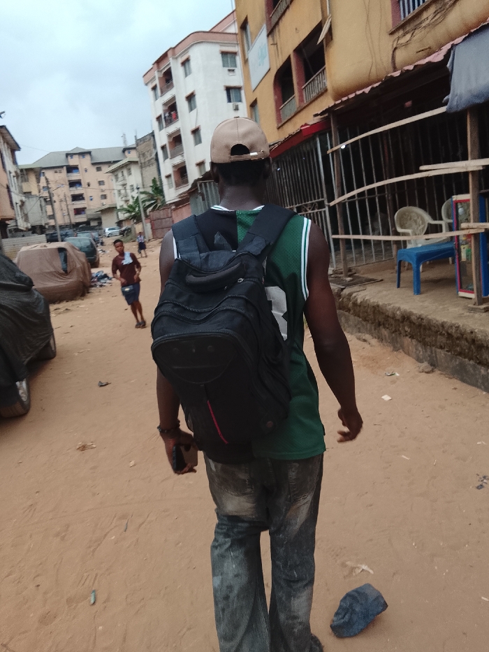 A person with a backpack is walking away from the viewer on a sandy street lined with buildings. The person wears a green and white jersey, jeans, and a tan baseball cap. A person is walking in the opposite direction. Cars are parked along the side of the street, with some covered by tarps. A shop with metal bars and furniture is on the right side. The sky is overcast.