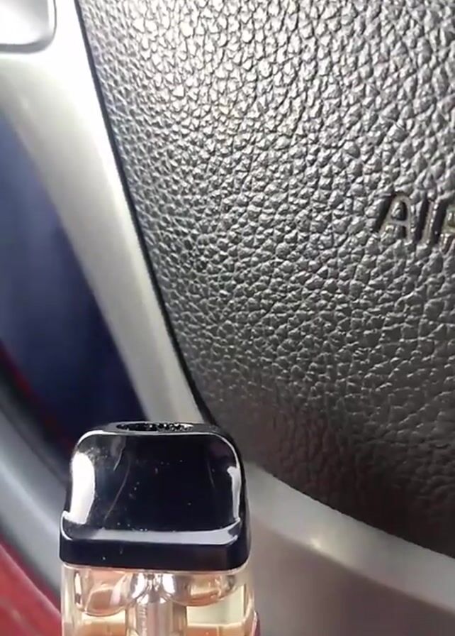 close-up of a small, gray and transparent vape device with a black mouthpiece. It is held in a person's hand in front of the steering wheel of a car. The steering wheel is black leather with the word "AIRBAG" visible on it. The car interior appears to be red on the left side of the frame. The vape device contains a clear liquid that appears to be vape juice. The camera remains still throughout the video.