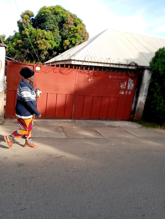 A woman in a dark head covering, patterned pants, a dark sweater, and orange sandals walks along an asphalt road. Behind her, a red metal gate topped with barbed wire guards a white building with a corrugated metal roof. A large green tree stands to the left, and some greenery is on the right side of the building. The scene is bathed in sunlight.