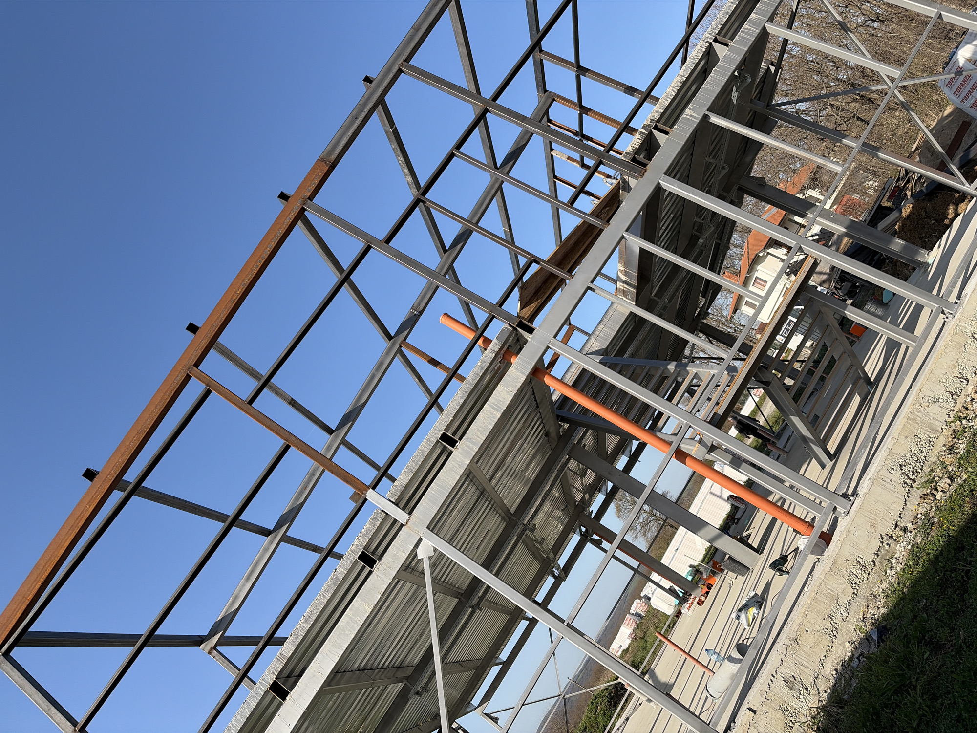 metal framework structure under construction in Kiten, Bulgaria. The framework is made of steel beams and has an open lattice design on the top section. Some of the steel is rusted. Below this open section is a corrugated metal roof. Orange pipes are visible, potentially related to the structure's infrastructure. The background reveals a clear blue sky. A house with a red-tiled roof, as well as other buildings, trees, and construction materials are also visible. There is a concrete foundation and a grassy area. The overall impression is that of an active construction site.