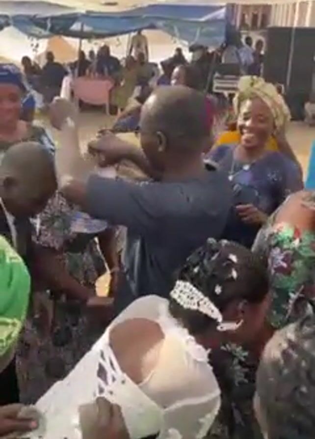 The video captures a joyous wedding celebration with many attendees gathered under a large tent, decorated with blue and white designs. The bride, in a white wedding dress, is surrounded by guests who are dancing and celebrating. The camera focuses on a man in a dark gray shirt dancing enthusiastically in the middle of the crowd, interacting with other party goers as he moves. The guests include men dressed in traditional Nigerian attire and women wearing colorful traditional dresses and headwraps. Some individuals are clapping and smiling. The setting suggests a lively and festive event, likely outdoors given the natural light and large tent.