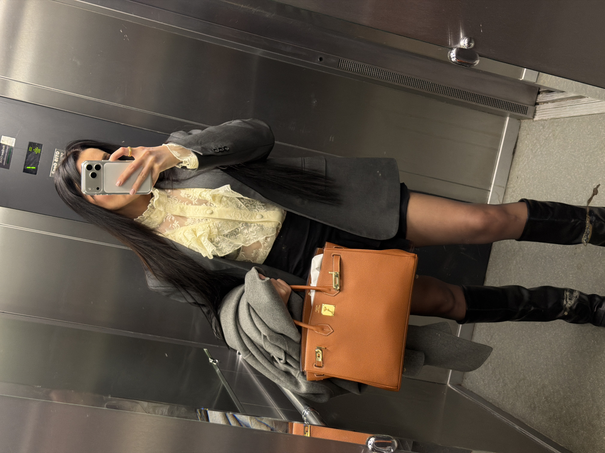 A young woman is taking a selfie in an elevator. She is wearing a gray blazer, a lace blouse, a black skirt or shorts, and black knee-high boots. She is holding a brown leather handbag and a gray garment. The elevator has metal walls. The location is Moscow, Russia.