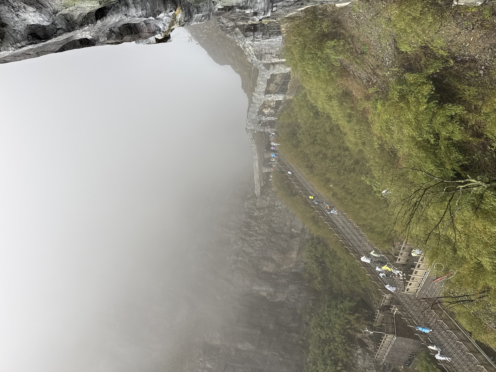 This image depicts a steep, misty mountain pathway on Tianmen Mountain in Zhangjiajie, China. The scene is characterized by dense fog, obscuring the upper portions of the mountains and creating a diffused, overcast light. A long, multi-level wooden boardwalk or staircase with railings winds upwards from the lower left towards the mid-ground. Numerous individuals, identified as tourists, are visible ascending the pathway. Many wear rain ponchos in various colors, including white, blue, and yellow, indicating damp conditions. To the right of the pathway, the mountain slope is covered with dense green foliage, primarily bamboo, interspersed with areas of exposed rock and scree. Further up the path, a substantial stone or concrete structure with multiple arched openings, resembling a series of grottoes or a covered passage, is integrated into the mountainside. People are visible near and within this structure. On the far right, a sheer, dark grey rock face extends vertically, showing textured surfaces and a small stream of water descending near its base. The overall environment is rugged, with man-made structures facilitating tourist access amidst the natural mountain topography and atmospheric conditions. No explicit interactions between individuals are discernible; subjects appear to be moving independently along the designated route.