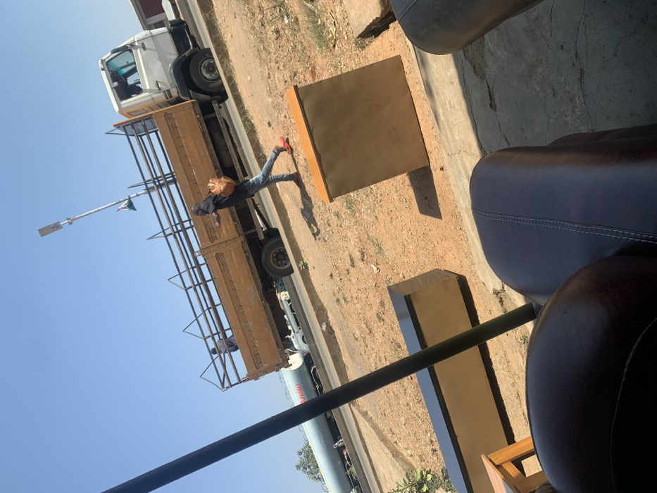 The image depicts a daytime scene on a dusty roadside in Jos, Nigeria, showing a mix of commercial activity and urban environment. In the immediate foreground, from a low perspective, dark brown upholstered furniture, possibly seating, is partially visible. A dark, vertical pole obstructs the view on the left. On the unpaved, reddish-brown ground directly ahead, two modern, box-like furniture units with dark bases and light brown tops are positioned; one is cuboid, the other a longer rectangle. A male individual is captured mid-stride, walking from right to left on the dusty roadside. He wears a dark short-sleeved shirt, blue jeans, and red footwear, carrying a light brown backpack on his back. His left arm is extended forward. Behind him, a paved road runs horizontally across the frame. A large, light-colored flatbed truck with a wooden cargo bed and metal railings is either parked or moving slowly on the road. A second male individual is seated in the cargo bed, facing away from the camera. Further left on the road, a light blue tanker truck, bearing the word "AFASALI" in white, is visible. A tall utility pole with a solar panel and an LED street light fixture stands on the far side of the road, displaying a small Nigerian flag (green-white-green). The sky is clear and bright blue, indicating fair weather. Sparse vegetation is present on the left side of the dusty verge, and distant structures are visible on the right.