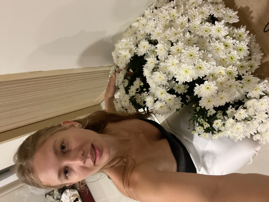A woman takes a selfie, holding a large bouquet of white chrysanthemums. She wears a black top and is indoors. The background consists of a white wall and possibly a window with blinds. The image appears to be taken at a close-up angle with the flowers dominating the upper right portion of the frame. Her expression is casual, with a slight smile. A small gold necklace is visible on her chest.