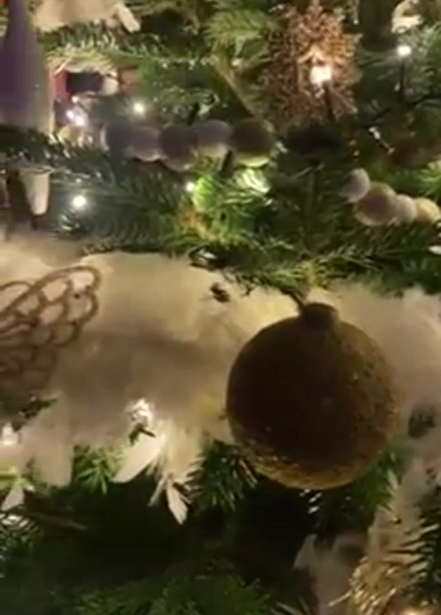 decorated Christmas tree. The tree is green with white feathers and white and gold ornaments. There are small white lights on the tree. The camera pans slowly from bottom to top.