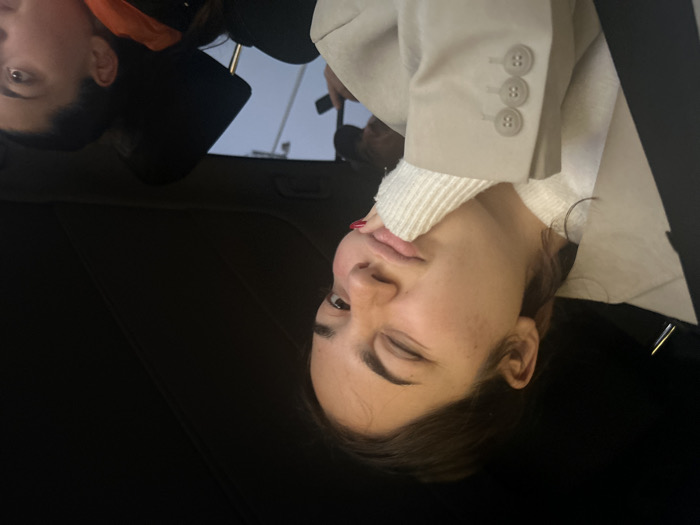 The image captures the interior of a vehicle, stated to be in Vendenheim, France. In the foreground, a female subject occupies the front passenger seat, winking with her right eye while her left eye remains open. Her left hand supports her chin, displaying red nail polish on her fingertips. She wears a light beige jacket with three visible buttons on the sleeve cuff over a white ribbed sweater. A dark seatbelt crosses her torso. Behind her, a second individual, partially obscured by a seat headrest, occupies a middle-row seat and holds a dark rectangular object, possibly a mobile phone. A third individual with dark hair is partially visible in the rear seat to the right, wearing an orange-colored top and gazing forward or downward. The vehicle's interior ceiling is dark-colored. Outside the vehicle, visible through the window, an overcast sky is present, along with blurred, indistinct structures in the background.
