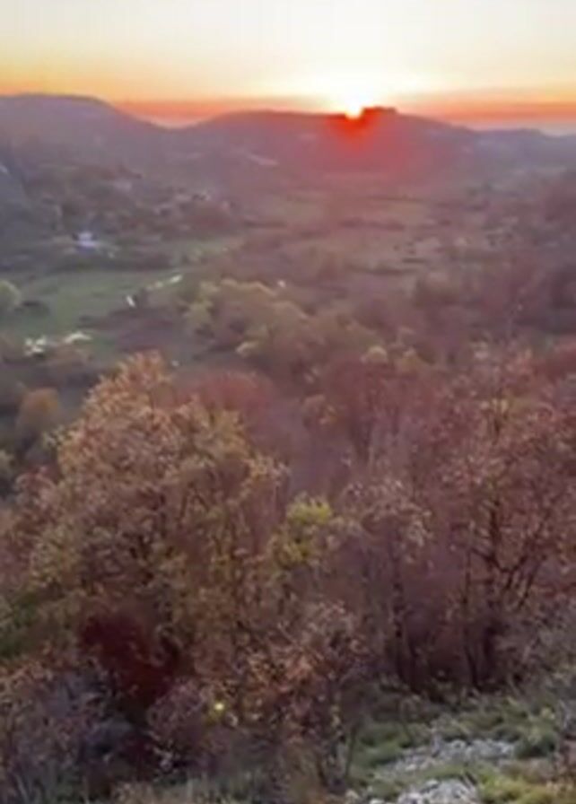 The video presents a picturesque scene of a sunset over a valley, filmed from an elevated position. The sun is seen setting between distant hills, creating a bright orange and red glow on the horizon. The foreground consists of trees with autumn foliage, their leaves displaying a mix of green, brown, and reddish hues. The valley below is a mix of fields, trees, and what appears to be a small stream or river winding through it. The overall atmosphere is peaceful and serene, highlighting the natural beauty of the landscape during sunset.