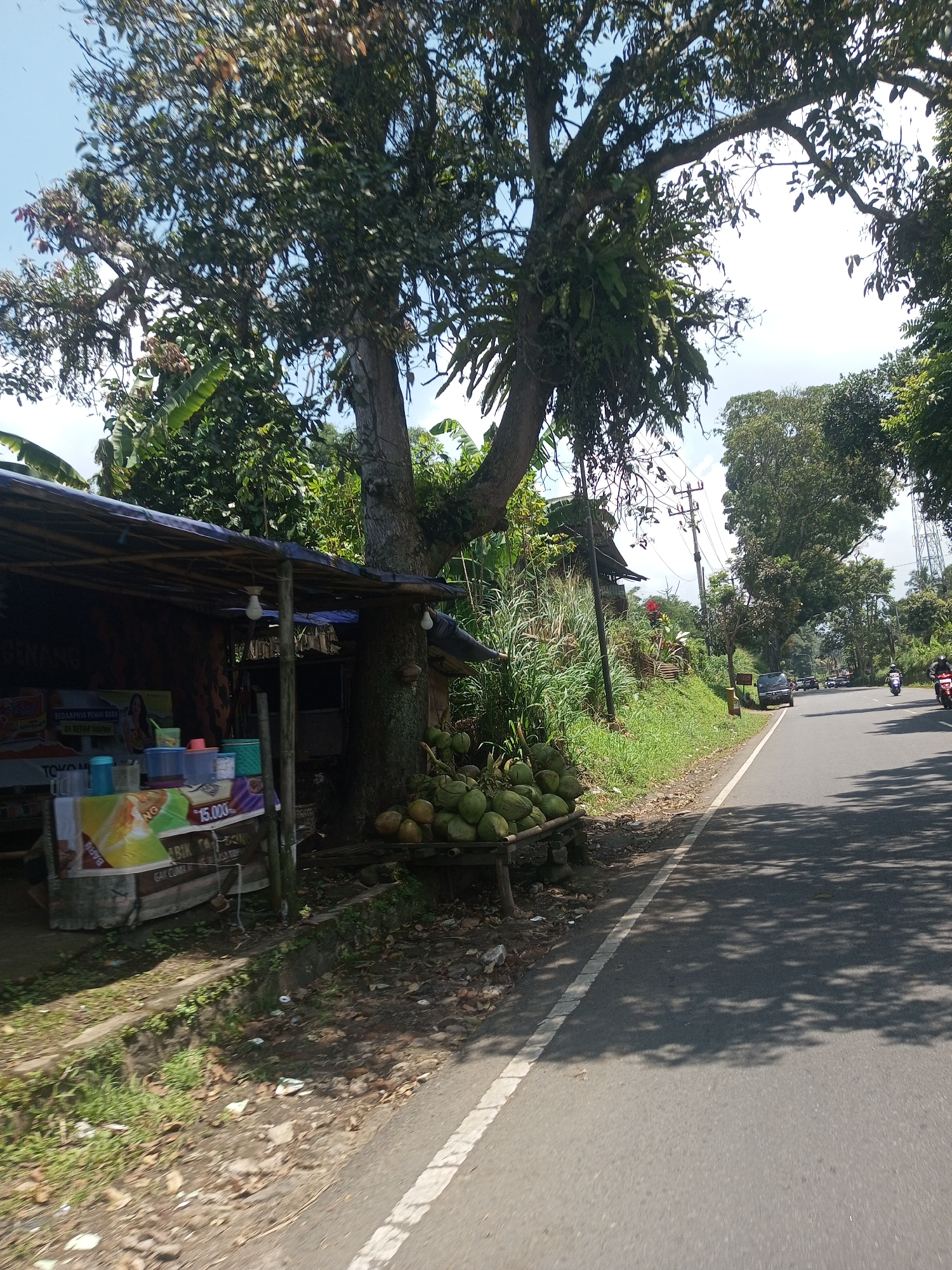 The image depicts a roadside scene, likely in a rural or semi-rural area. A small vendor stall is situated under a large tree. The stall appears to sell beverages or snacks, with colorful posters and containers visible. The ground around the stall is covered in fallen leaves and some litter. A pile of green coconuts is arranged near the base of the tree, possibly for sale. A paved road runs alongside the stall. Tree shadows are cast on the road surface. In the distance, cars and motorbikes are visible on the road, suggesting traffic. The surrounding environment includes green vegetation and trees lining the roadside, indicating a natural setting. The image does not provide information on the location in the city of Nawng Hkar, Myanmar.