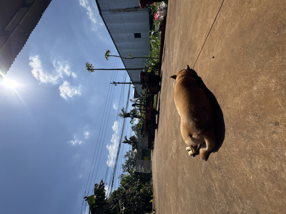 A brown and black dog rests on a concrete surface in the sunlight. A building lines the opposite edge, with utility lines and palm trees in between. Farm equipment sits parked alongside the building. The clear blue sky is dotted with white clouds.