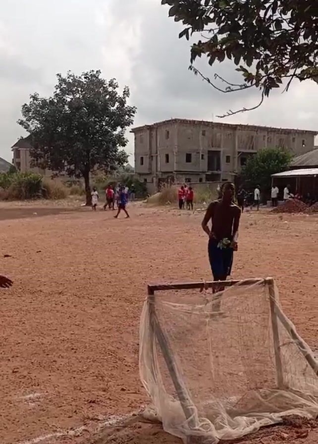 group of people on a dirt field, with a soccer game appearing to be in progress in the background. A small, makeshift soccer goal sits in the foreground. Two young men stand near the goal. One man is shirtless and the other wears a white t-shirt. They seem to be interacting playfully, throwing small objects at each other. The background reveals a building under construction, other structures, and trees under a cloudy sky.