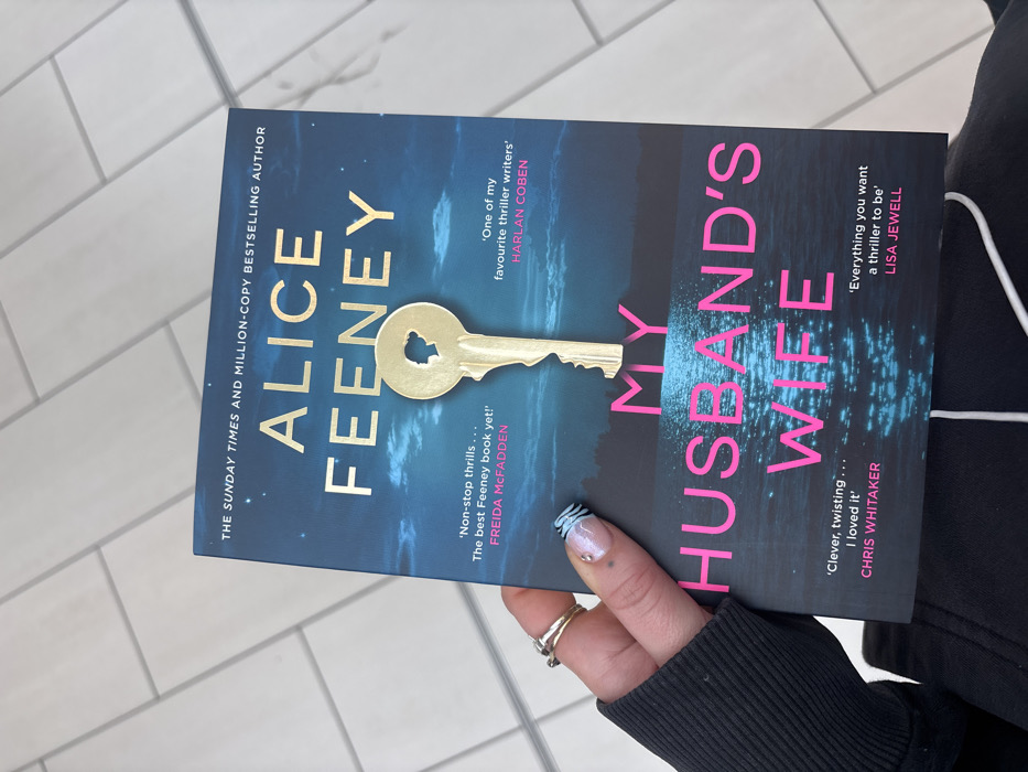 A close-up, slightly overhead photograph depicts a person's left hand holding a paperback copy of the book "MY HUSBAND'S WIFE" by Alice Feeney