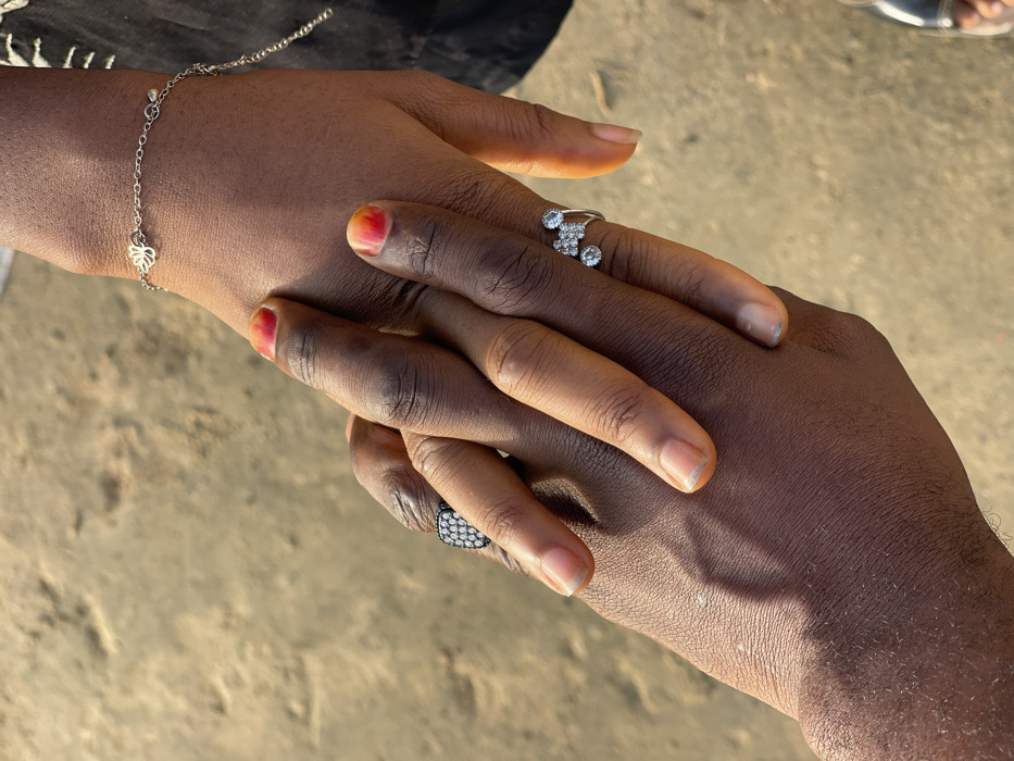 A close-up, downward-angled shot captures two hands, identified as male and female, clasped together over a sandy, light-brown ground surface under natural sunlight