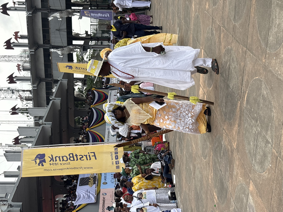The image depicts an outdoor public gathering at Tafawa Balewa Square in Lagos, Nigeria. In the foreground, two individuals in ceremonial attire walk from right to left across a paved plaza. The female wears a yellow top with fringe detail, a long yellow and white patterned skirt, and a wide-brimmed yellow and white hat; she holds a wooden staff with yellow tassels in her right hand and a dark rectangular object in her left. The male, walking slightly ahead, wears a white agbada, matching white and yellow hat, red beaded necklaces, and sandals; he carries a similar wooden staff in his right hand and a smartphone in his left. The background features a multi-tiered concrete stadium structure with numerous white statues of rearing horses flanking its entrance and dark, winged eagle-like figures atop the roofline. Yellow vertical banners with the "Firstbank" logo and "follow us" text are visible. Other horizontal banners display "LAGOS STATE GOVERNMENT" and mobile banking advertisements. A large crowd of people, including spectators and participants in various attire, are visible both in the stands and on the ground level. The sky is overcast.
