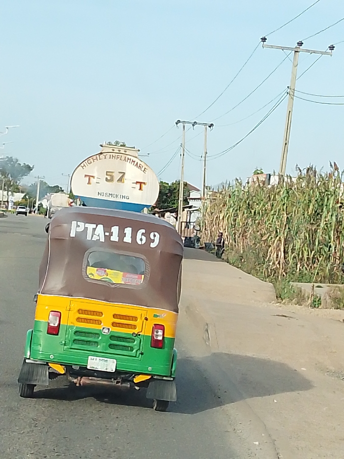 The image depicts a daytime street scene in Bukuru, Nigeria. A green, yellow, and brown three-wheeled auto-rickshaw, bearing the alphanumeric identifier "PTA-1169" in white on its brown canopy and a white license plate at its rear, is positioned centrally in the foreground, facing away from the viewer. Behind the auto-rickshaw is a white tanker vehicle with a rounded tank, prominently labeled "HIGHLY INFLAMMABLE," "T-57-T," and "NO SMOKING" in red and black lettering. The road surface is paved, and a dark shadow extends from the auto-rickshaw onto the road surface to its right. To the right of the road, a dense thicket of tall, leafy green plants, resembling corn or sugarcane, lines the roadside. A single individual, dressed in dark clothing, is visible standing near this vegetation on the right. Multiple utility poles with power lines traverse the scene, extending into the background on both sides of the road. On the left side of the road, a white passenger car is visible in the distance, and faint plumes of light-colored exhaust or smoke rise from that direction. The sky above is clear and light blue.