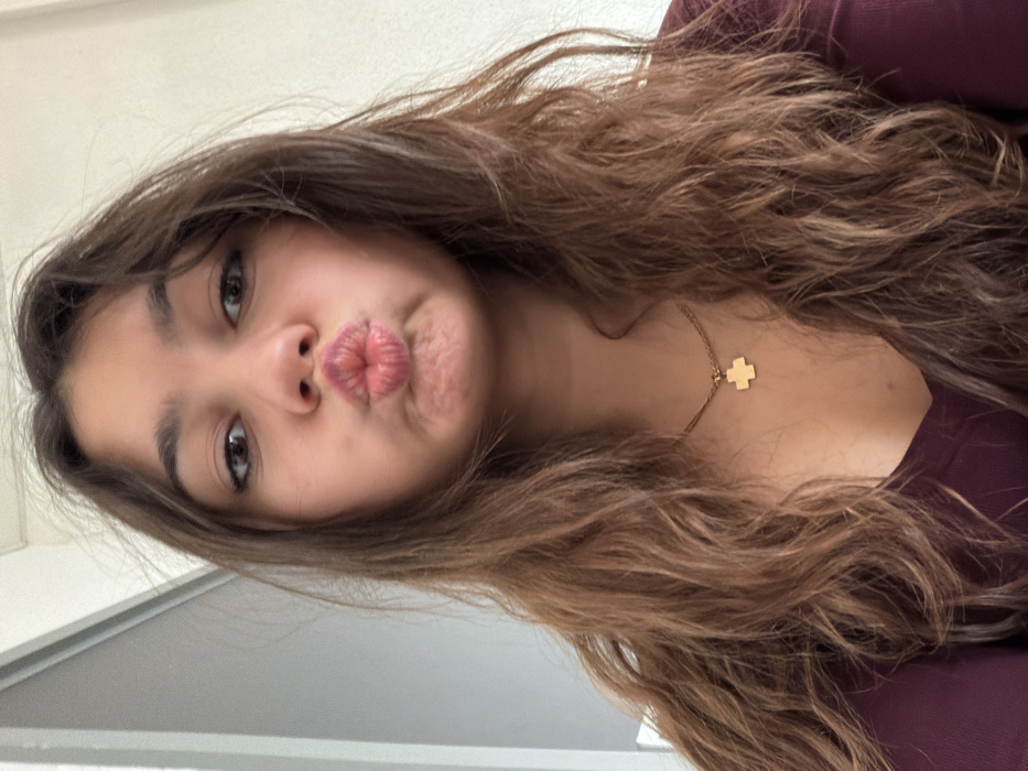 A close-up, head-and-shoulders portrait features a young female subject with long, wavy brown hair, looking directly into the camera. Her lips are puckered in a "kissing face" expression. She is wearing a maroon long-sleeved top with a V-neck. A gold-colored chain necklace with a flat, square cross pendant is visible on her chest. The background is a plain, light-colored wall with a vertical grey partition visible on the left side, consistent with an indoor setting in the city of Schiltigheim, France.