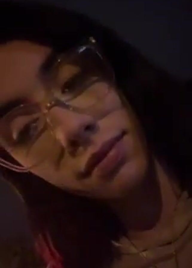 A person with long dark hair wearing glasses and a light-colored top is looking at the camera. They stick their tongue out briefly. The background is dark, possibly outdoors at night. A necklace is visible around the person's neck.