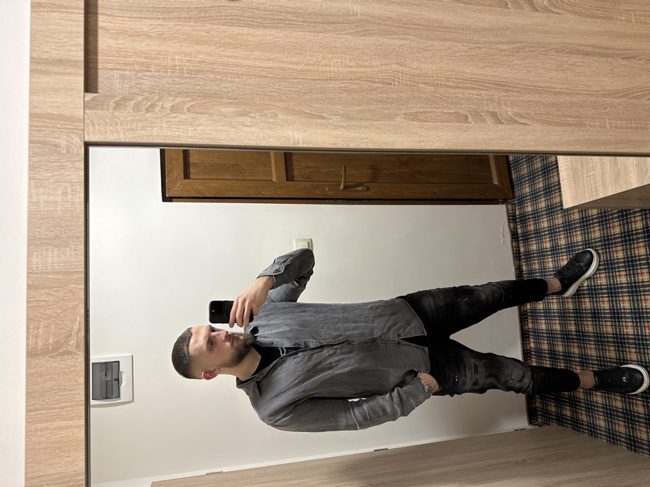 A male individual is depicted in a full-length mirror selfie taken inside a room in Radievo, Bulgaria