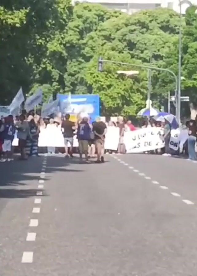group of people protesting in the middle of a street, seemingly in a city. They are holding banners and flags, some of which are white. The protesters are walking in the direction of the camera, filling most of the width of the road. On either side of the street are parked cars. There are trees lining the street and buildings in the background. The sky is bright and it appears to be daytime. There is a truck parked on the left-hand side of the street.