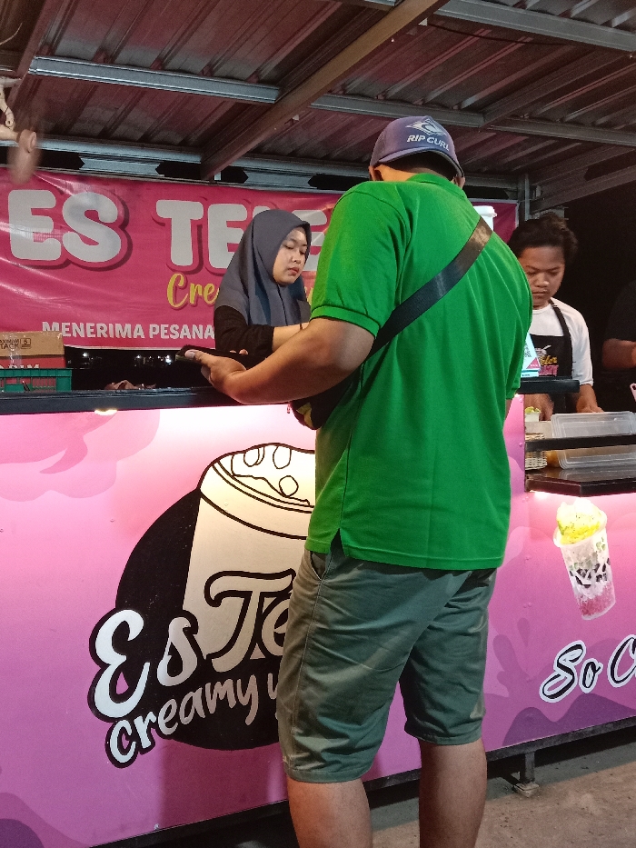 An illuminated food stall operates at night in Sekopek Wetan, Indonesia. A male customer, viewed from behind, wearing a green polo shirt, olive-green shorts, and a blue "RIP CURL" baseball cap, stands leaning on the pink counter of a vendor. He has a black strap from a shoulder bag crossing his back. A young adult female vendor, wearing a grey hijab and a black top, stands behind the counter, looking down as she appears to handle an item or transaction. To her right, another young adult male vendor, wearing a white apron, is partially visible also behind the counter, looking down. The stall features a pink exterior with a "Es Teh creamy" logo depicting a large beverage cup and text in white. A pink banner overhead displays "ES TEH" and "MENERIMA PESANAN" (Receiving Orders) in white lettering. The stall is topped with a metal corrugated roof with exposed metal beams. On the right side of the counter, a clear plastic cup containing a layered, colorful beverage with a yellowish topping is visible, along with other plastic containers. Overhead lighting illuminates the scene.