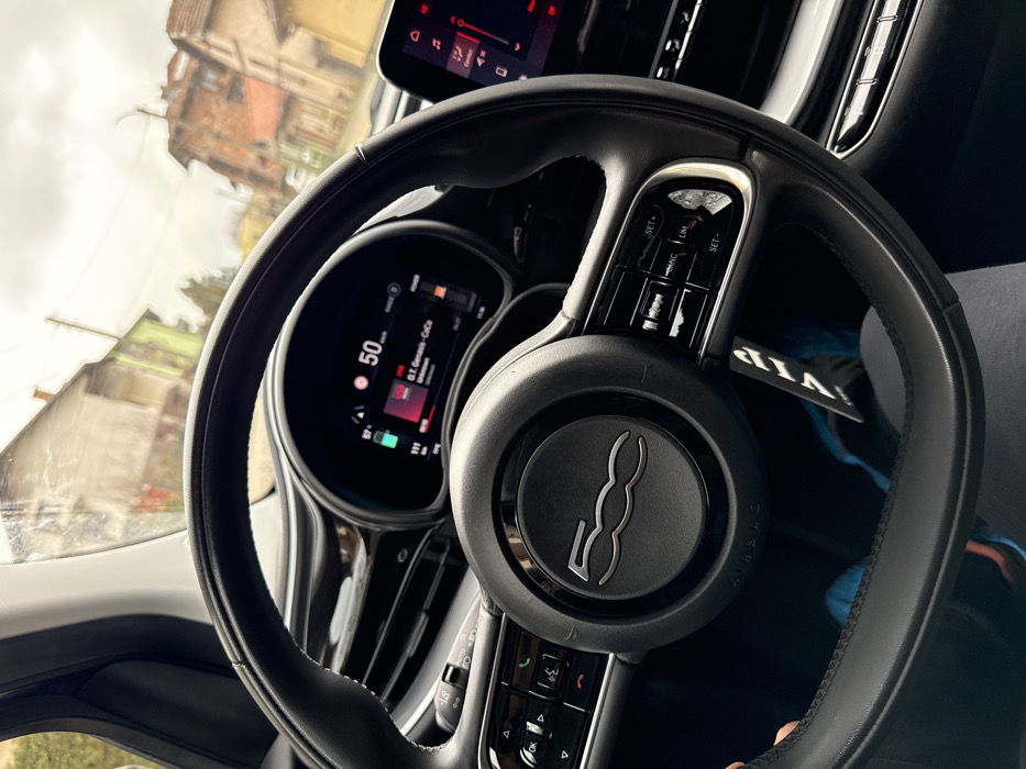 The image captures the interior of a Fiat 500 electric vehicle from a driver's perspective, looking forward through the windshield