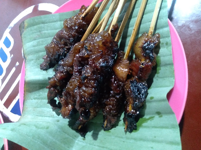 - "Multiple skewers of dark, glossy, grilled meat are arranged on a verdant banana leaf" by FM-FI4Yr1, licensed under CC BY 4.0