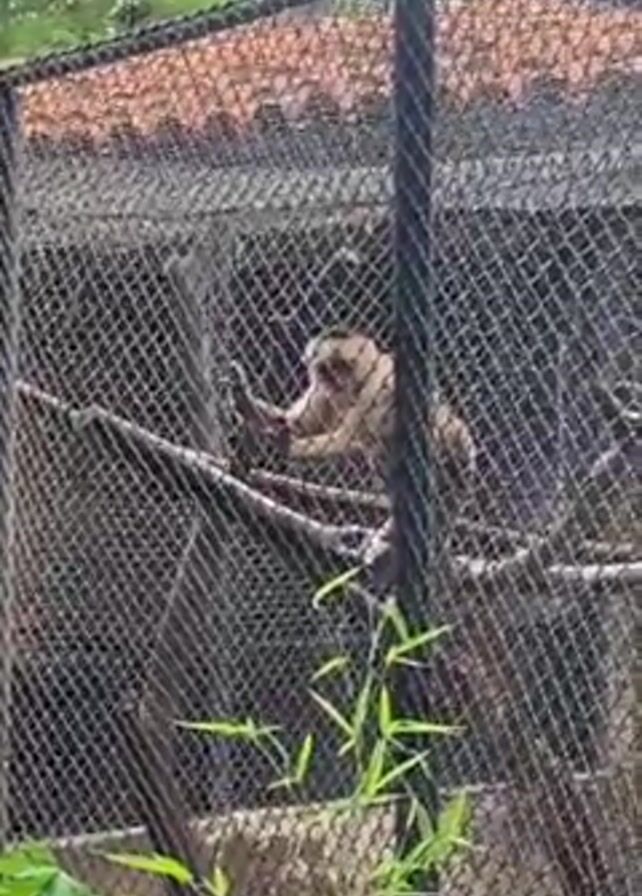 monkey in a cage. The cage is made of black wire mesh and has a red tile roof. Inside the cage, there are a few branches where the monkey is sitting. The monkey is light brown and is looking around. There is some green foliage in front of the cage. People are heard in the background.