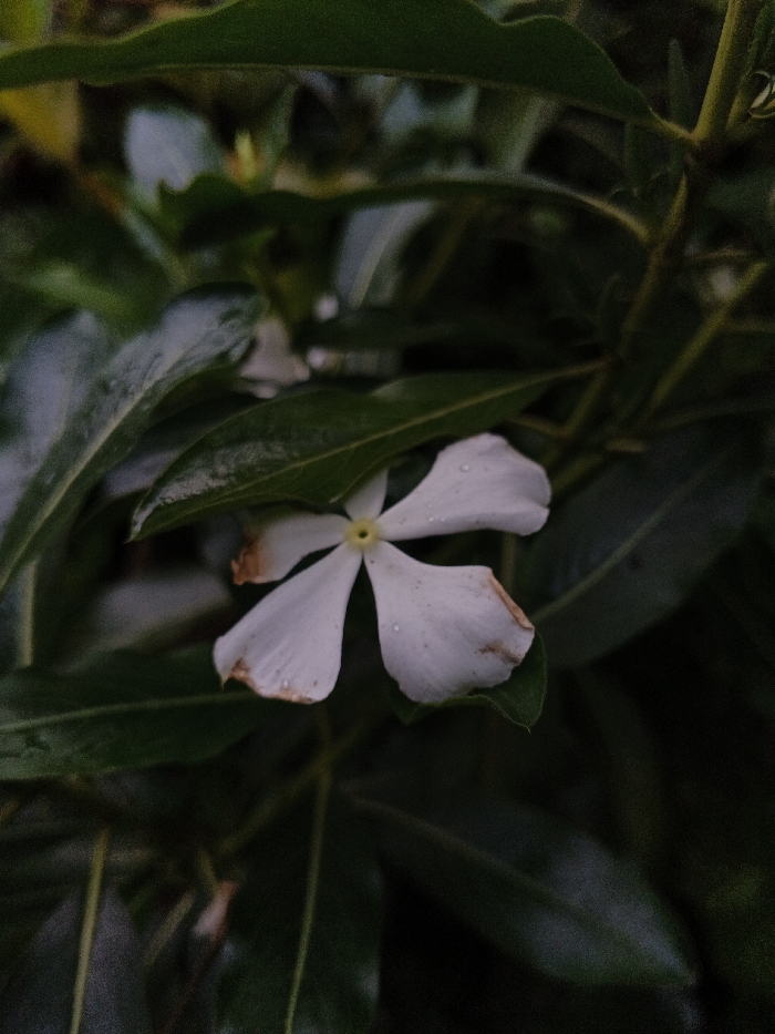 The image displays a close-up view of a single white five-petaled flower, possessing a yellow center, situated amidst dark green foliage. Water droplets are visible on the flower's petals and the surrounding leaves. The edges of some petals exhibit brown discoloration. The flower is partially framed and subtly obscured by various dark green leaves and stems, which comprise both foreground and an out-of-focus background. No individuals or animals are present in the scene. The environment consists entirely of plant matter. This scene is located in the city of Unknown, Cambodia.