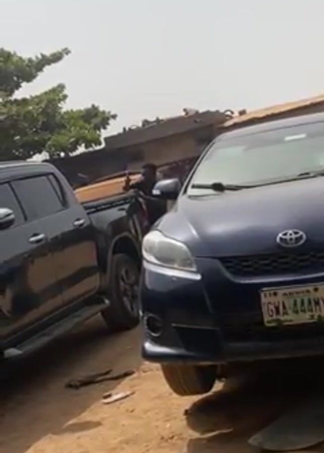 The scene shows a dirt lot with three vehicles parked. In the foreground is a dark blue Toyota Matrix with a license plate reading "GWA-444MY." Next to it, to the left, is a black pickup truck. A person is standing near the rear of the pickup truck, wearing a dark shirt. In the background, there's a building and some trees. The weather appears sunny. A sound like a hammer hitting metal can be heard.