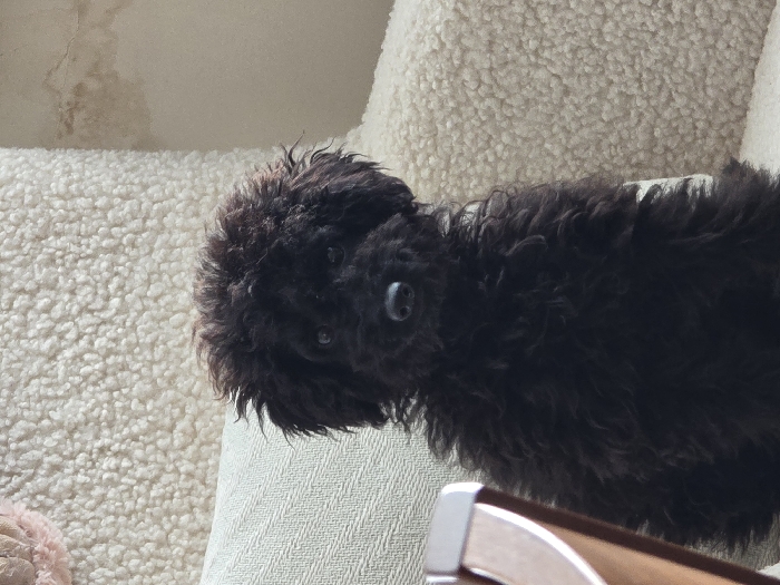 - "The image, captured in the city of Pleven, Bulgaria, depicts a small, black, curly-coated dog, likely a poodle, positioned centrally and facing the camera directly" by FM-aYhu23, licensed under CC BY 4.0