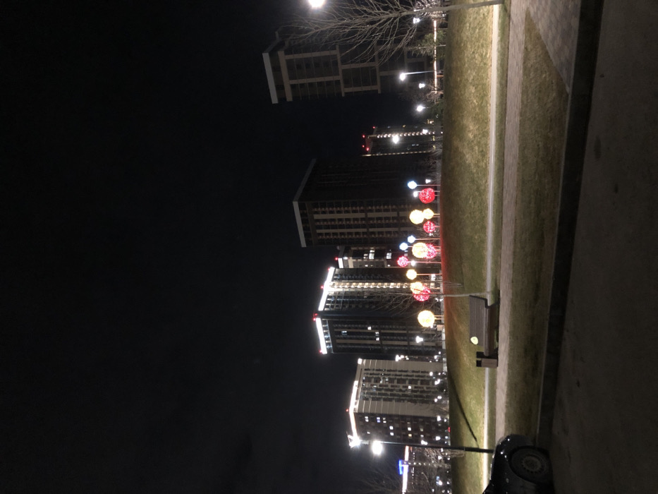 Night cityscape features several illuminated tall buildings, some adorned with strings of red and yellow spherical lights. A narrow strip of grassy land runs parallel to the buildings, bordered by a paved path. A bench is visible on the grass. A dark car appears in the bottom right corner, partially cut off by the frame. The sky is dark, with a few barely visible tree branches.