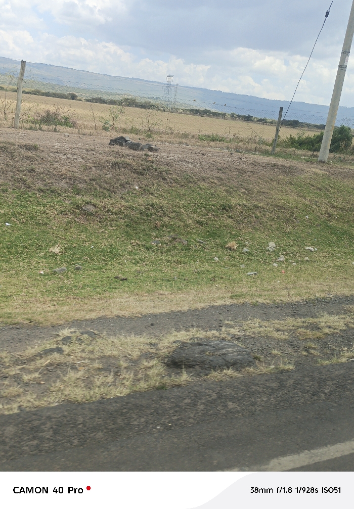 The image depicts an outdoor landscape in Malewa West ward, Kenya, under a partly cloudy sky. In the immediate foreground, a dark asphalt road with a faint white line on its right edge is partially visible. Above the road, a gravelly shoulder transitions into an upward-sloping embankment covered by a mix of green and dry, light-brown grass. Scattered small rocks and white and red debris are present on this grassy slope. A small, yellowish-brown, indistinct object is situated within the green grass in the lower-middle portion of the embankment. Higher on the embankment, a cluster of larger dark rocks or boulders is visible. A wire fence, supported by light-colored wooden posts, runs horizontally across the top of the embankment, separating it from a vast, open field. This field, predominantly light brown or tan, contains sparse vegetation and small trees. Several small, dark birds are perched on a wire of the fence in the mid-ground. To the right, a tall, light-colored utility pole with electrical wires extends upwards. In the background, a range of dark-vegetated hills stretches across the horizon. A metal lattice-style electrical transmission tower is visible in the far-left distance, positioned against the hills. No individuals or specific actions are discernible.