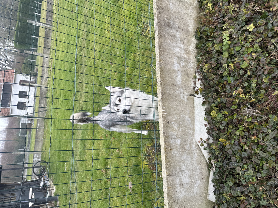 This image depicts an outdoor residential scene in Lambres-lez-Douai, France, observed through a green wire mesh fence. In the foreground, a dense carpet of ground cover featuring small green and reddish-brown leaves blankets the ground. Above this, a weathered concrete barrier, approximately 30 centimeters high, exhibits light grey and discolored patches, along with minor surface scratches. Behind the concrete barrier and the wire mesh fence, a medium-sized canine, consistent with a husky breed or mix, stands on a green lawn. The dog possesses grey, white, and black fur, pointed ears, and light-colored eyes, and is looking directly forward towards the viewer. Its bushy tail is curled upwards over its back. The lawn shows variations in greenness and contains some sparse, brown areas. In the mid-ground to background, a multi-paneled wooden structure with dark double doors is visible on the left, next to which a white outdoor table and a bicycle with a silver wheel are positioned. Towards the right, a white residential house with a distinct orange-tiled roof and dark windows is present. Further background elements include additional green wire fencing supported by concrete posts, delineating property lines. The sky overhead is uniformly overcast and light grey, and distant trees appear bare, indicating a dormant season. No human individuals are visible.