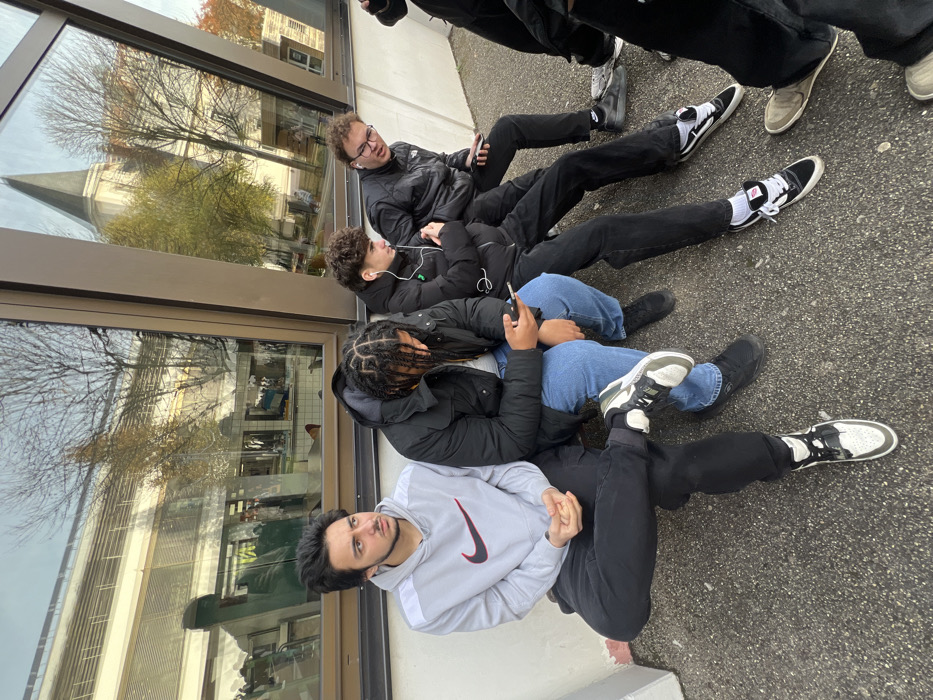 The image displays four young males seated outdoors against a building facade in Schiltigheim, France