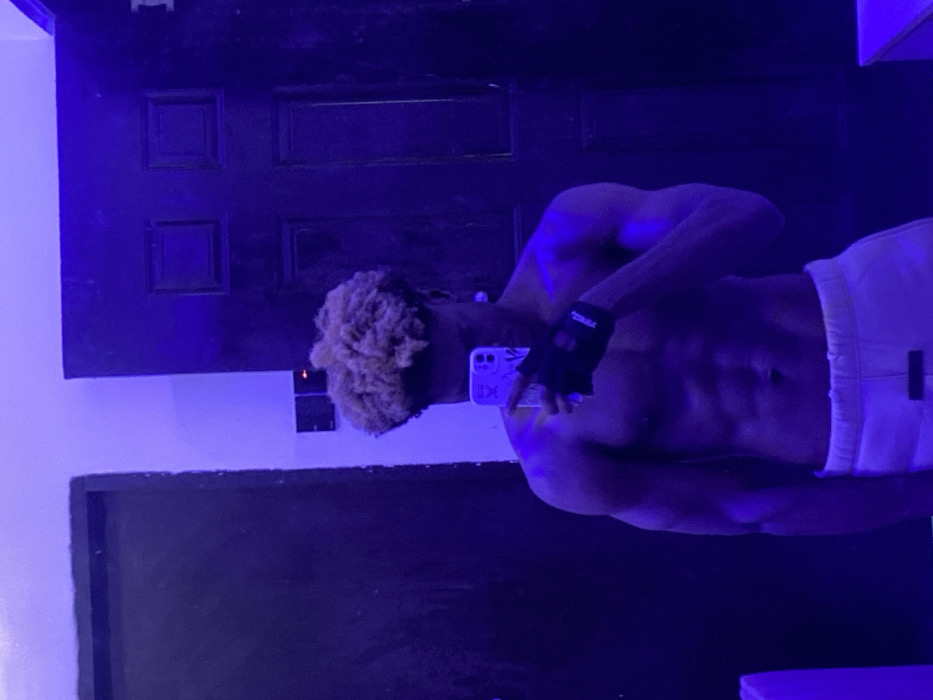 A muscular person with fair hair is shown from the shoulders down, turned sideways, taking a mirror selfie with a smartphone. They wear white shorts and a black glove on the hand holding the phone. The setting has a dark, low-lit atmosphere with blue and purple tones. A dark door with square panels is in the background. A black frame is visible in the lower left corner.