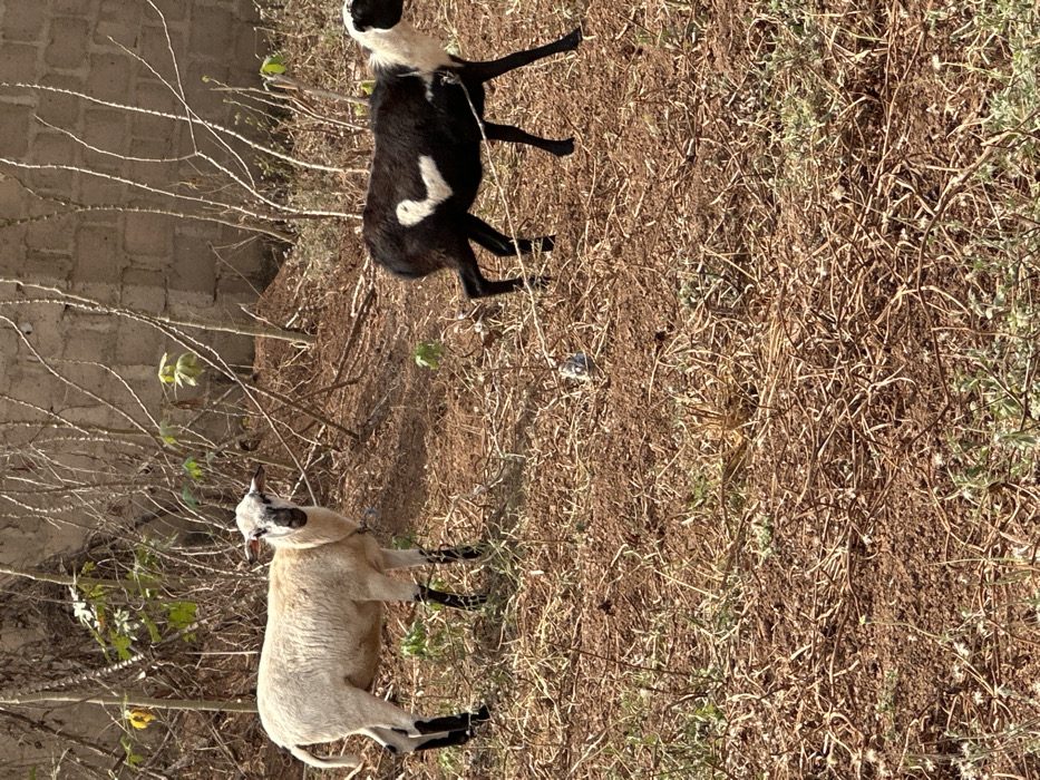 This image depicts a rural scene in Agbogugu, Nigeria. Two sheep are present on dry, reddish-brown ground covered with sparse, dried vegetation and some green shoots. The sheep on the left is light-colored, predominantly white, with black markings on its face and lower legs; it is standing still and looking directly forward. A blue collar or rope is visible around its neck. The sheep on the right is largely black with a distinct white, inverted heart-shaped marking on its left flank and a white head; it is positioned in profile, walking towards the right of the frame. In the background, a concrete block wall is partially visible, partially obscured by numerous thin, mostly leafless plant stalks or branches, with some green foliage present on a few plants. The scene is illuminated by natural light, suggesting daytime conditions.