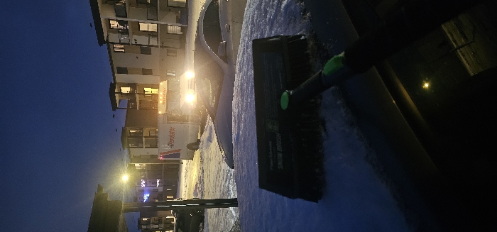 A car with snow on the roof is being brushed with a black snow brush with a green handle. Street lights illuminate the building in the background. A white truck is parked beside the building. The sky is dark blue.