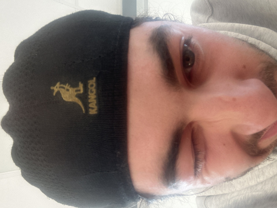 A close-up image depicts a male individual, primarily focusing on his upper face. He is wearing a black Kangol cap with a gold kangaroo logo and "KANGOL" text embroidered on the front. His left eye is tightly closed in a wink, creating visible wrinkles around the outer corner, while his right eye is open and directed towards the viewer. His eyebrows are dark and prominent, and traces of facial hair are visible on his upper lip and chin. He wears a grey hooded garment, likely a sweatshirt. The background is indistinct, appearing as a plain, light-colored surface, possibly a ceiling or wall, indicating an indoor environment. The image does not contain any discernible visual information to determine its specific location within the city of Carvin, France.