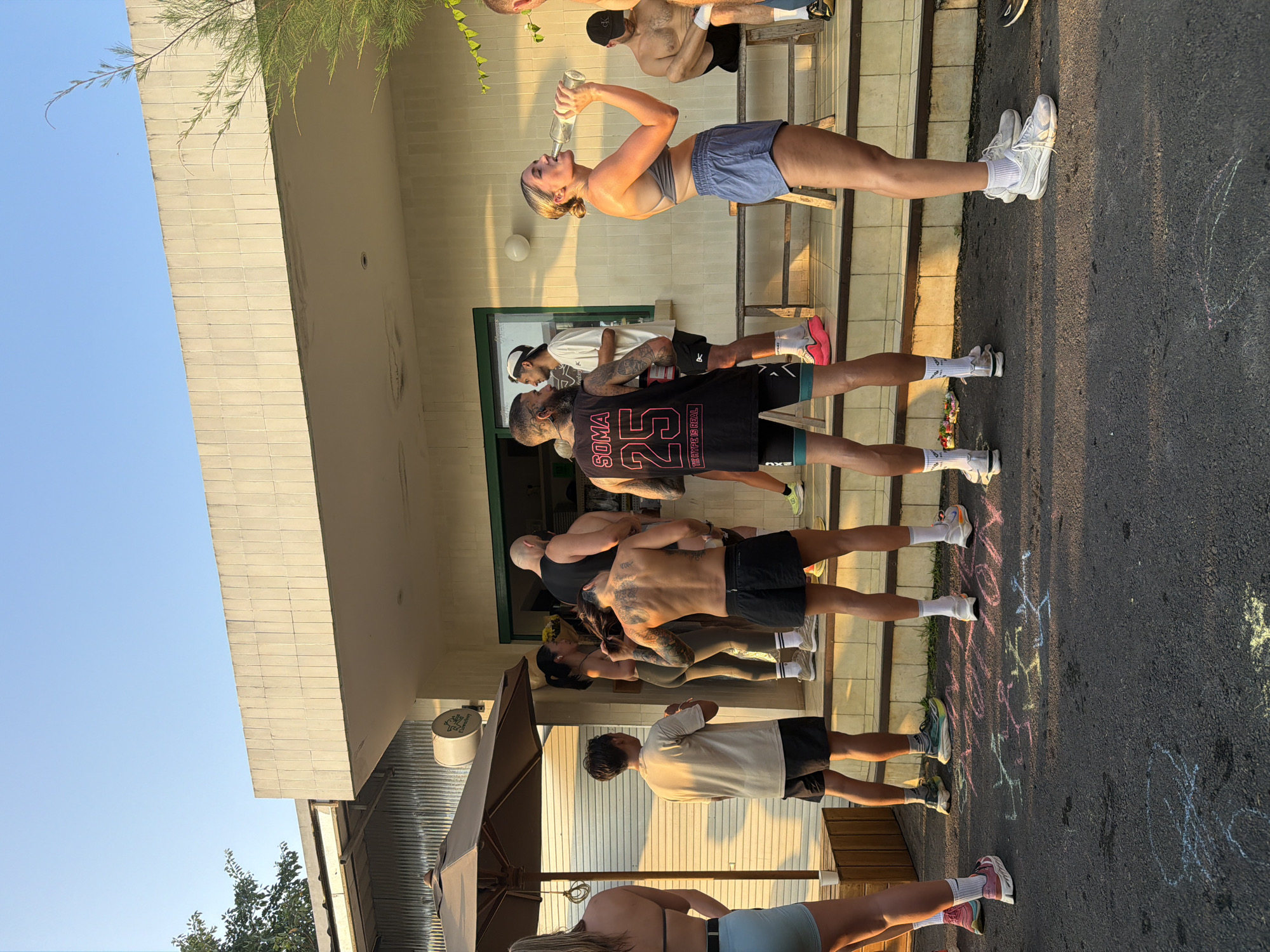 The image depicts an outdoor gathering of approximately twelve to fifteen individuals, predominantly adults, in what appears to be a post-exercise social setting during the golden hour, casting long shadows. The location is an urban or semi-urban environment in Unknown, Indonesia, under a clear blue sky. The scene is dominated by a single-story building featuring a light-colored, vertically-grooved facade and a projecting overhang. A green-framed window or doorway is visible on the building's front. A circular white fixture with "Flowstate" branding is mounted on the facade to the left of the green frame. To the left of this building, a structure with corrugated metal siding is partially visible. In the foreground, a dark paved surface exhibits multiple colorful chalk drawings. People are positioned on this paved area, on wooden steps leading up to the building, and on a wooden bench outside the building. Key individuals and their actions include: * On the far left, a woman with her back to the camera, wearing a light blue sports bra and shorts, stands beside a low wooden platform. * Next to her, a man in a light t-shirt and dark shorts looks towards the building. * Center-left, a shirtless man with extensive back and arm tattoos, wearing black shorts, faces the building while seemingly adjusting his hair. * Center-right, a man in a black tank top with "SOMA 25 THE HYPE IS REAL" printed on the back, and cycling shorts, also faces the building. * Right of center, a woman in a grey sports bra and blue shorts is actively drinking from a clear plastic water bottle, her head tilted back. * On the far right, a shirtless man in dark shorts and a black cap sits on a wooden bench. * On the steps and within the building's doorway, several other individuals are conversing, including a woman in olive athletic wear, a bald man in a black tank top, and two men in t-shirts. Most individuals are dressed in athletic attire, including shorts, tank tops, sports bras, and athletic footwear. Many have visible tattoos. A small, colorful offering (Canang Sari) is visible on the ground near the steps to the left. A large, brown outdoor umbrella is partially visible on the far left.