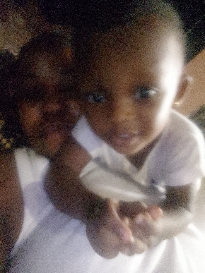 This low-resolution, blurry image depicts two individuals in the city of Warri, Nigeria. A young child, likely a toddler, with dark skin and short dark hair, is prominent in the foreground, looking directly at the camera. The child wears a light-colored, possibly white, collared shirt and a small, gold-colored earring in the right earlobe. Their hands are clasped together centrally, indistinctly holding an unidentified object. Behind and to the left of the child, an adult with dark skin is partially visible, wearing a light-colored garment. The background is dark and out of focus, devoid of specific environmental identifiers. The scene appears to be an informal indoor or low-light outdoor setting.