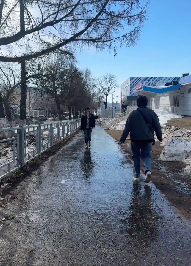 Two people are walking away from the camera down a wet, paved path. The person in the foreground is wearing a dark jacket, blue jeans, and white sneakers, with a bag slung over their shoulder. The other person is wearing a similar outfit but with tan boots and a baseball cap. The path is lined on the left by a low metal fence and bare trees, and on the right by patches of snow and a modern building with blue and white accents. The sky is clear and blue. The ground reflects the sky and the people walking on it.