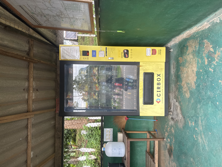 A yellow Cirbox vending machine stands outdoors, stocked with drinks and snacks, reflecting the surrounding trees in its glass front. To its left, a weathered structure with a framed map hangs above. To its right is a green wall, and below, a water dispenser and a small wooden table with a broom leaning against the vending machine. The area has a slightly overgrown and lived-in feel.