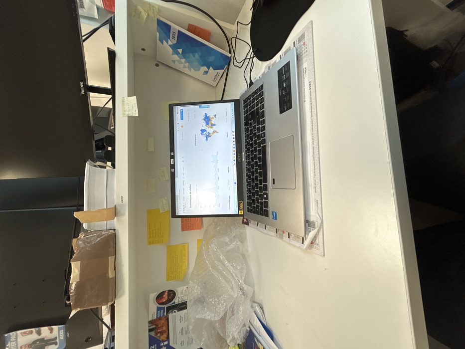 The scene depicts an active office workstation located in Illkirch-Graffenstaden, France. A silver Acer laptop, displaying a webpage with "Statistiques de visites" (Visit statistics) and a global map, rests open on a white desk, positioned atop a document. To the laptop's immediate left, a crumpled clear plastic material, resembling bubble wrap, is piled on top of several papers. A black mouse pad and a partially visible black computer mouse are positioned to the right of the laptop, with black cables extending from the laptop in the same direction. Above the desk, on a white shelf, a brown cardboard box secured with tape sits to the left, adjacent to a stack of white papers. Two dark computer monitors, one branded "PHILIPS," are visible behind these items. The white back panel of the workstation is adorned with numerous yellow and orange sticky notes bearing handwritten text. On the left side of this panel, a brochure featuring food imagery and text including "CARTER PACK" is present. On the right, a white binder or book with a blue geometric pattern and the year "2025," along with "Côté Création," leans against the back panel. A small standee or cutout figure labeled "ALEXIS" is visible on the far left edge of the shelf. No individuals are present in the image.