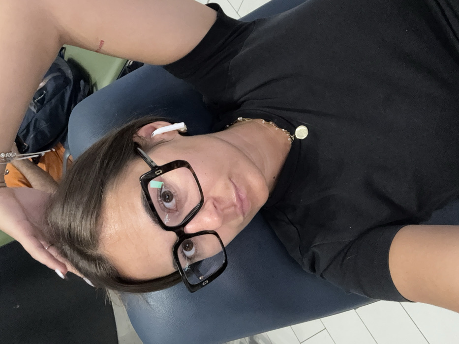 The scene is located in Arnavutköy, Turkey. A female subject is depicted taking a selfie while reclining in a blue seat, consistent with an indoor waiting area or terminal. She has dark brown hair parted in the middle and wears large, square-framed tortoiseshell eyeglasses, identifiable with "Marc Jacobs" branding on the temple. A white wireless earbud is visible in her right ear. She is wearing a black short-sleeved t-shirt and two necklaces: a gold-colored chain with a circular pendant and another, possibly beaded, necklace. Her right arm is raised, with her hand touching the back of her head, and a faint red tattoo is visible on her right bicep. Her expression is neutral, with slightly pursed lips and direct eye contact with the camera. In the blurred background, partial views of another individual include an arm adorned with bracelets, orange fabric, and a dark blue object resembling a bag or another seat. The flooring in the foreground consists of light-colored tiles with dark grout lines.