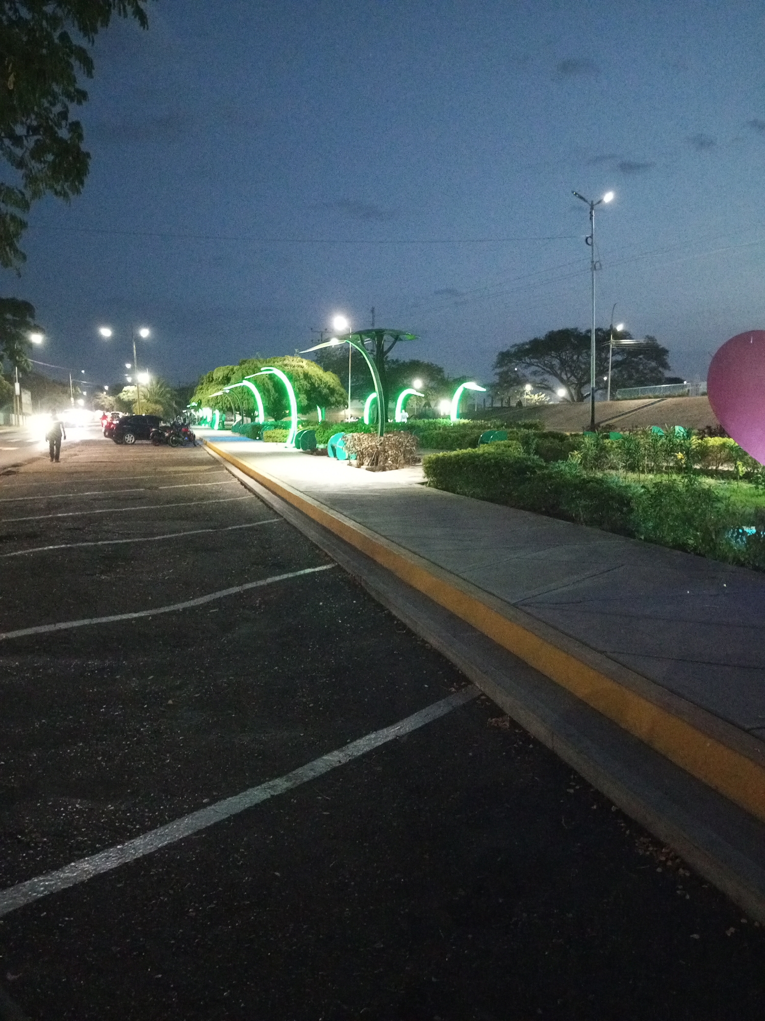 The image depicts an outdoor scene in Villa de Todos los Santos de Calabozo, Venezuela, at dusk or night. A parking lot with white lane markings is in the foreground, and a sidewalk runs alongside it, separated by a curb with a yellow stripe. On the other side of the sidewalk is a landscaped area with hedges, plants, and decorative green-lit arches. Streetlights illuminate the area. In the background, there are trees, and on the far right, a large pink balloon is visible. A person is walking on the side of the road in the middle-left of the image, near several parked cars.