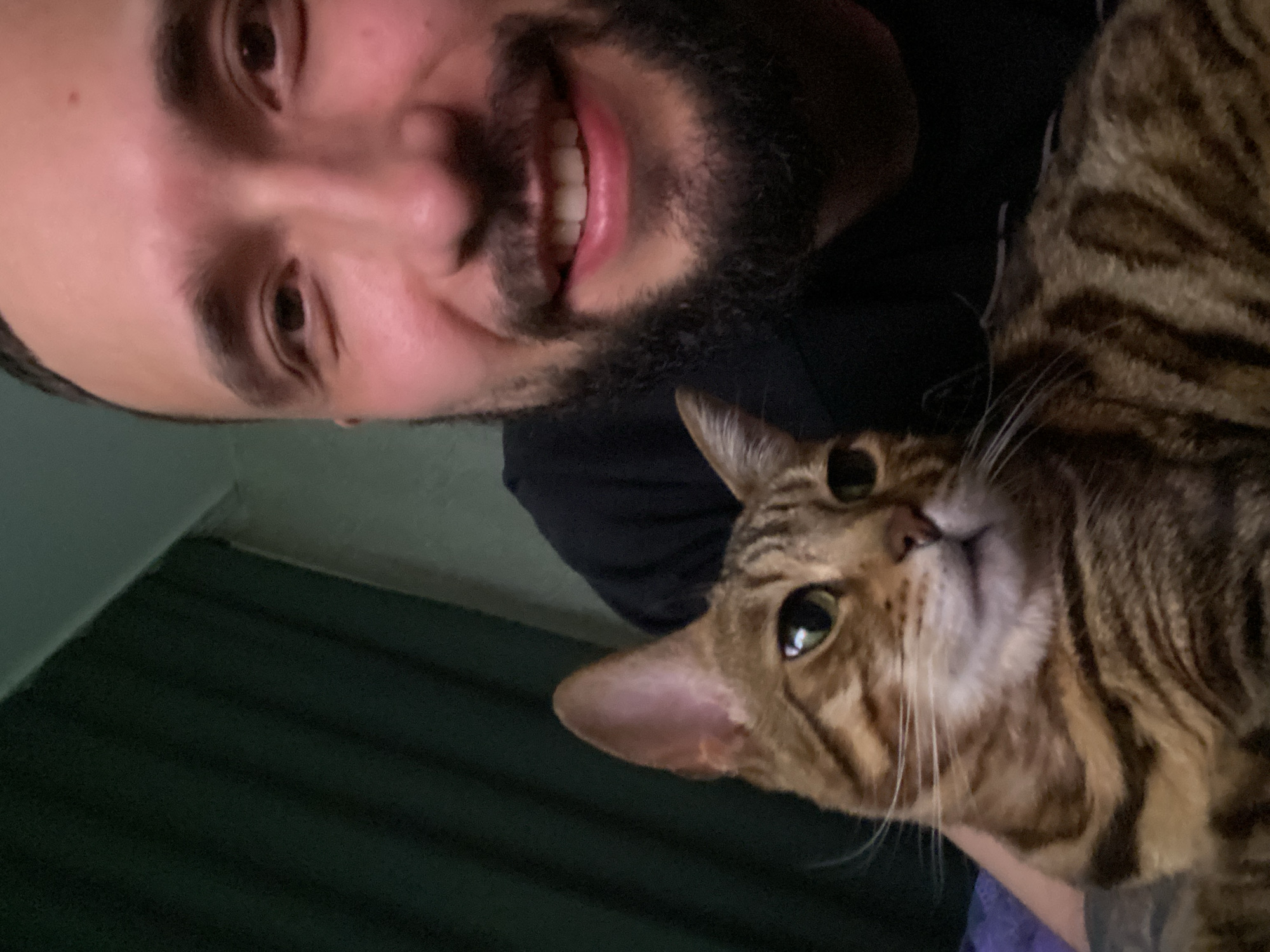 man and a cat in an indoor setting. The man has brown eyes, a beard, and is smiling. The cat is a brown tabby with distinctive markings and green eyes. The background is blurred and appears to be a wall with vertical lines or paneling. There is no information in the image to identify the location as the city of Chaikovsky, Russia.